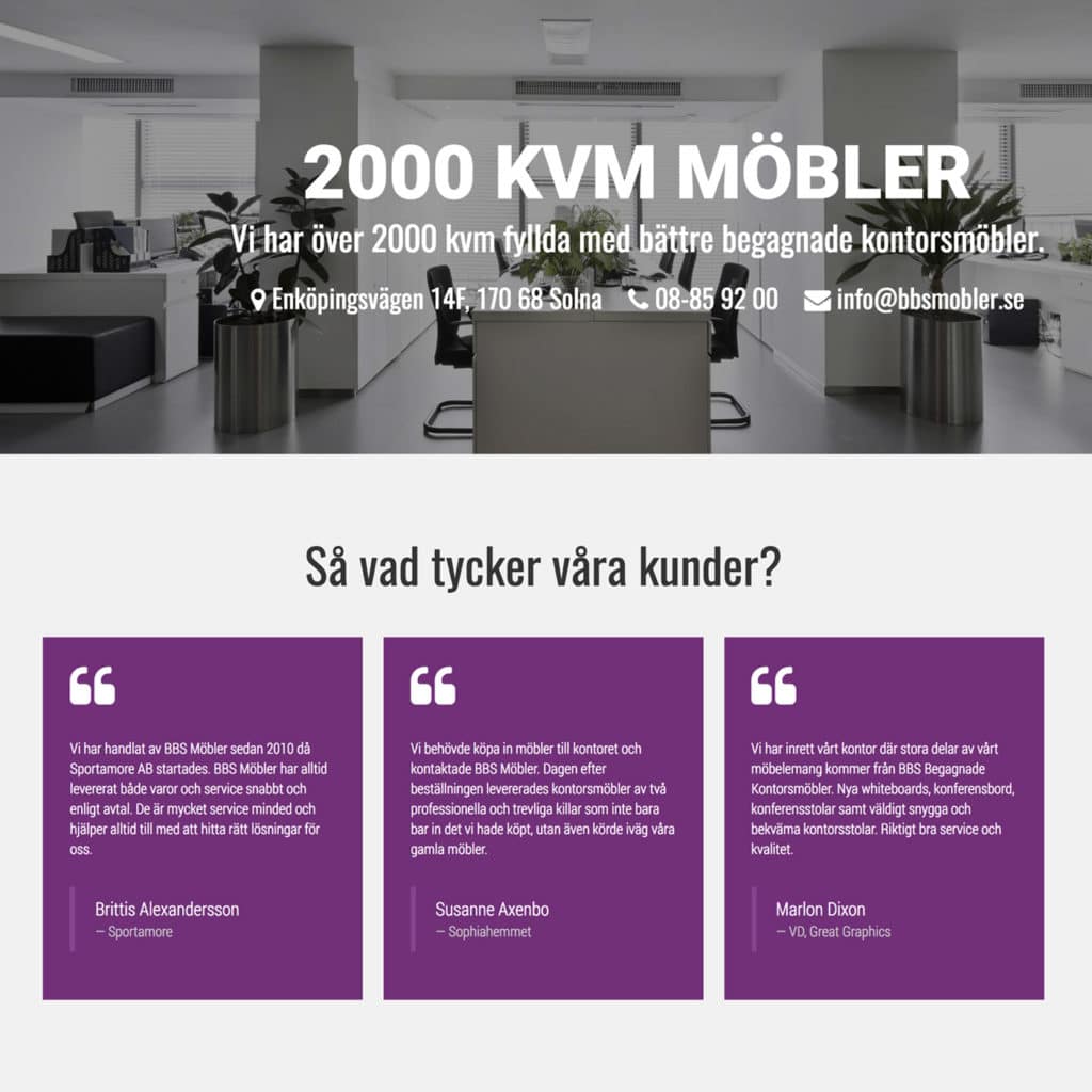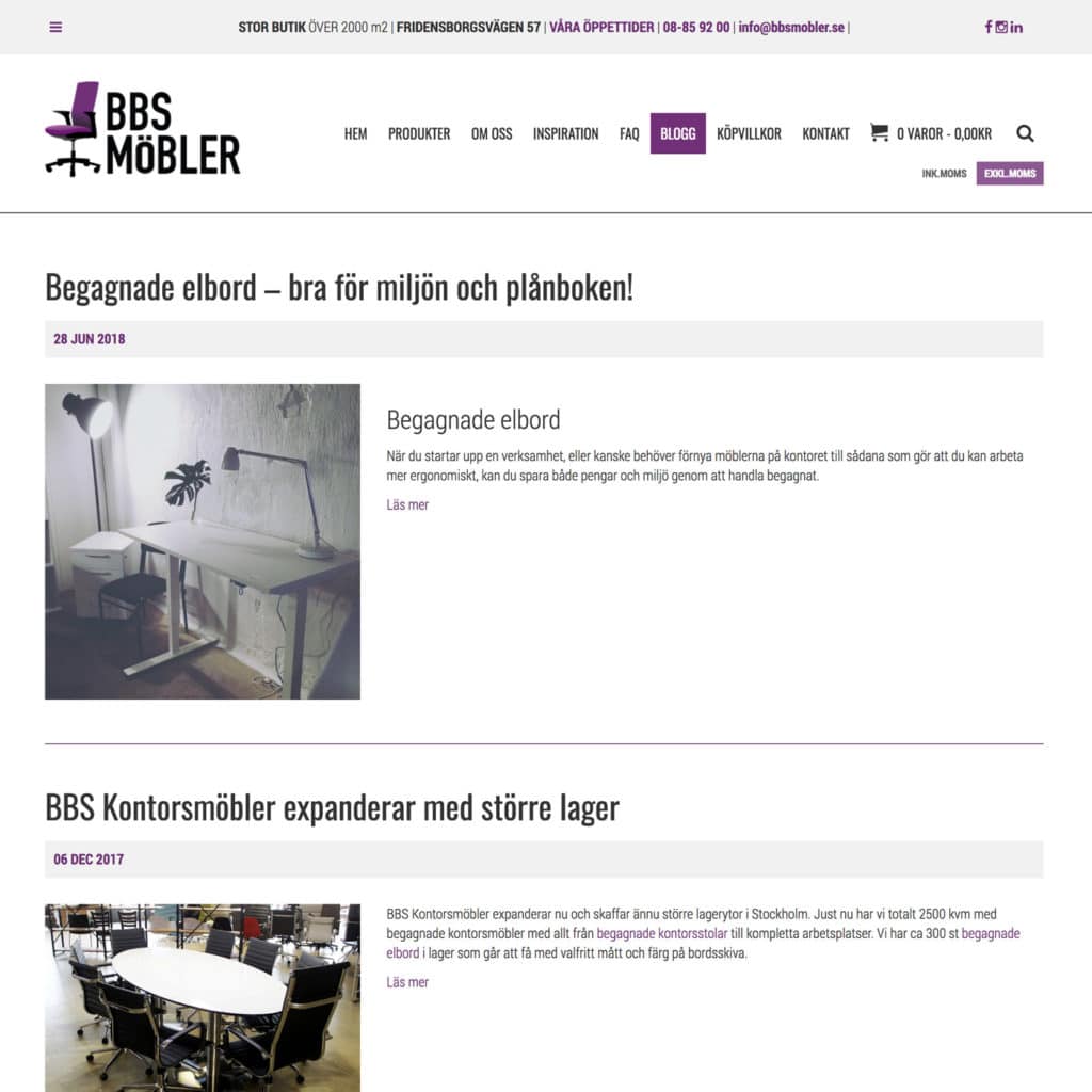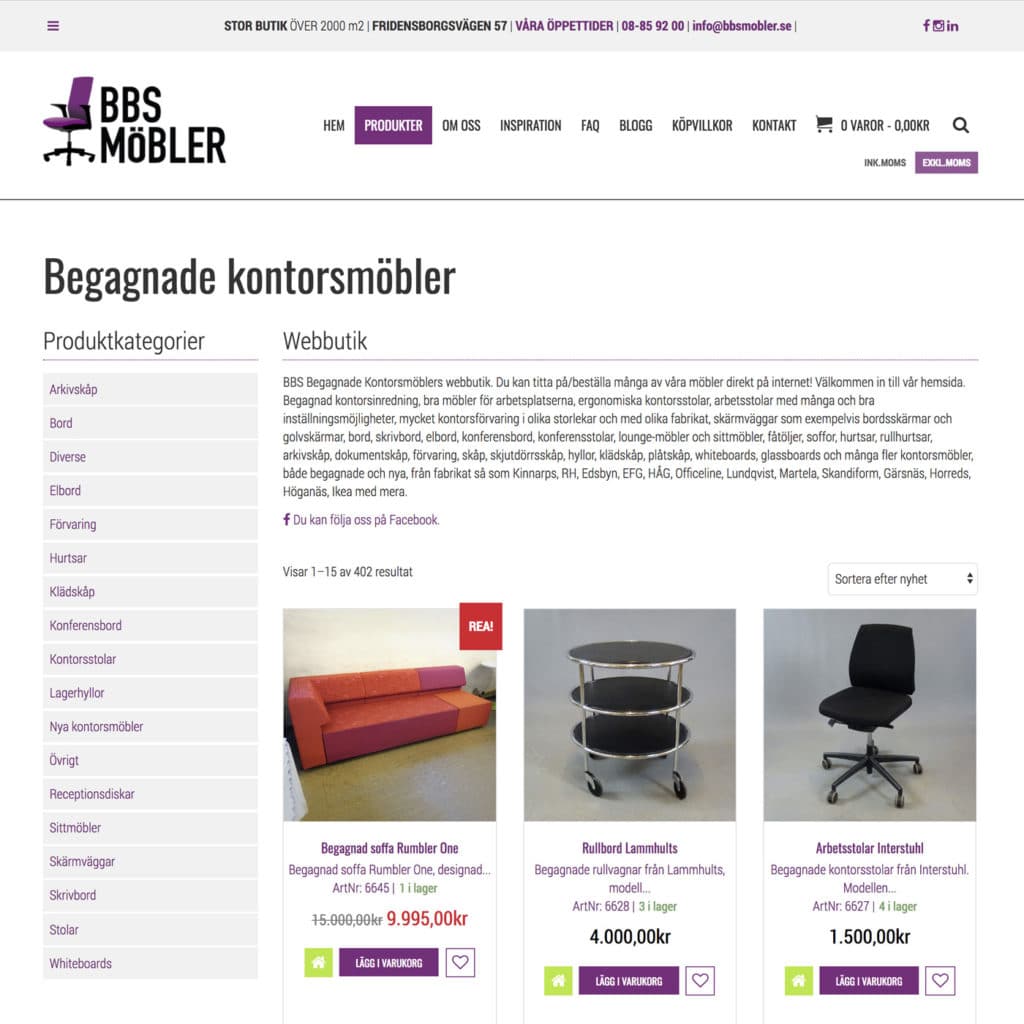 BBS-Begagnade Kontorsmöbler vill göra om sin dåvarande hemsida till en E-handels plattform. Designen skulle vara i samma känsla som föregående hemsida i val av färger och mönster för att bibehålla igenkänningsfaktorn, men med en modernare touch. Hemsidan byggdes i WordPress/WooCommerce med en del särskild programmering för att möta kundens önskemål och behov.