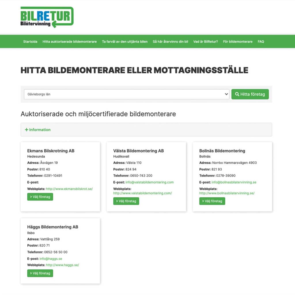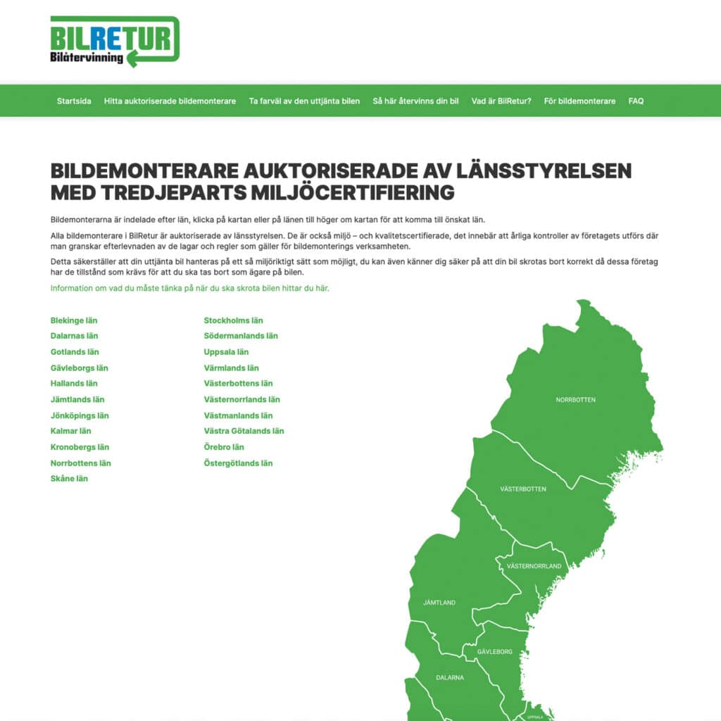 Bilretur är ett nationellt nätverk av länsstyrelsen auktoriserade bildemonterare. Alla bildemonterare i nätverket är även miljö och kvalitetscertifierade. Det innebär att årliga kontroller utförs att man följer de lagar och förordningar som reglerar bildemonterings verksamheten. De utgör även en del av bilproducenternas mottagningssystem. Länkar finns i höger spalt till bilproducenterna samt BIL Sweden, som är branschorganisationen för de svenska tillverkarna och importörerna av bilar, bussar och lastbilar.
