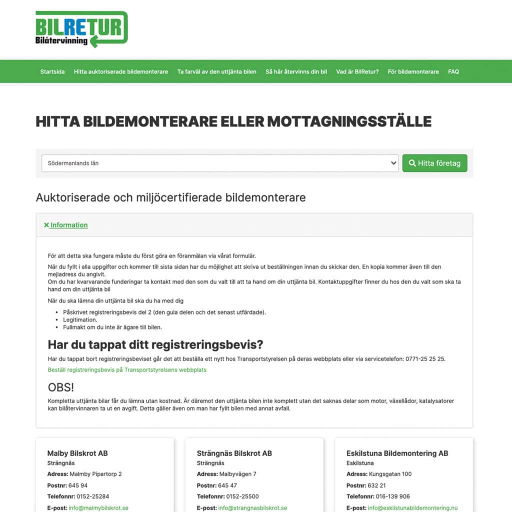 Hit kan du tryggt vända dig när det är dags att göra sig av med den uttjänta bilen. Målsättningen är att det via BilRetur ska vara enkelt att hitta till din närmaste bildemonterare, när det är dags att återvinna/skrota den uttjänta bilen. Läs mer på bilretur.se